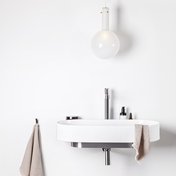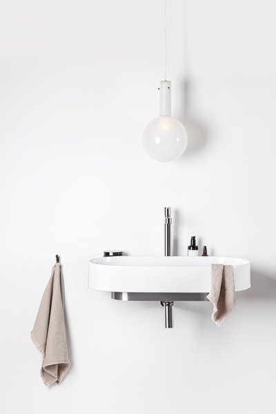La vasque ovale est complétée par un élément de design sous la forme d’une console de fixation en blanc, noir ou acier inoxydable. La console, le mitigeur, le siphon et la bonde forment un ensemble élégant au ton unique.