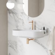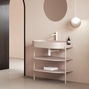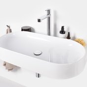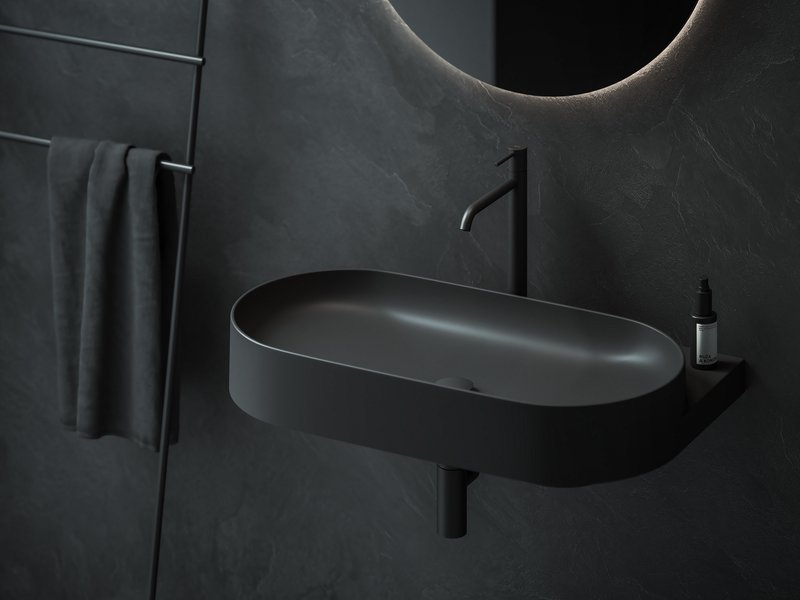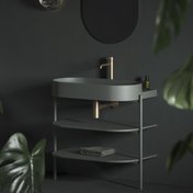 La vasque ovale est complétée par un élément de design sous la forme d’une console de fixation en blanc, noir ou acier inoxydable. La console, le mitigeur, le siphon et la bonde forment un ensemble élégant au ton unique.